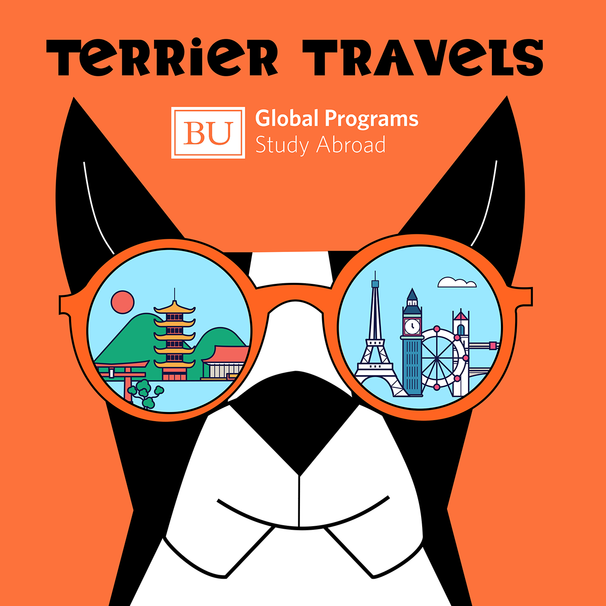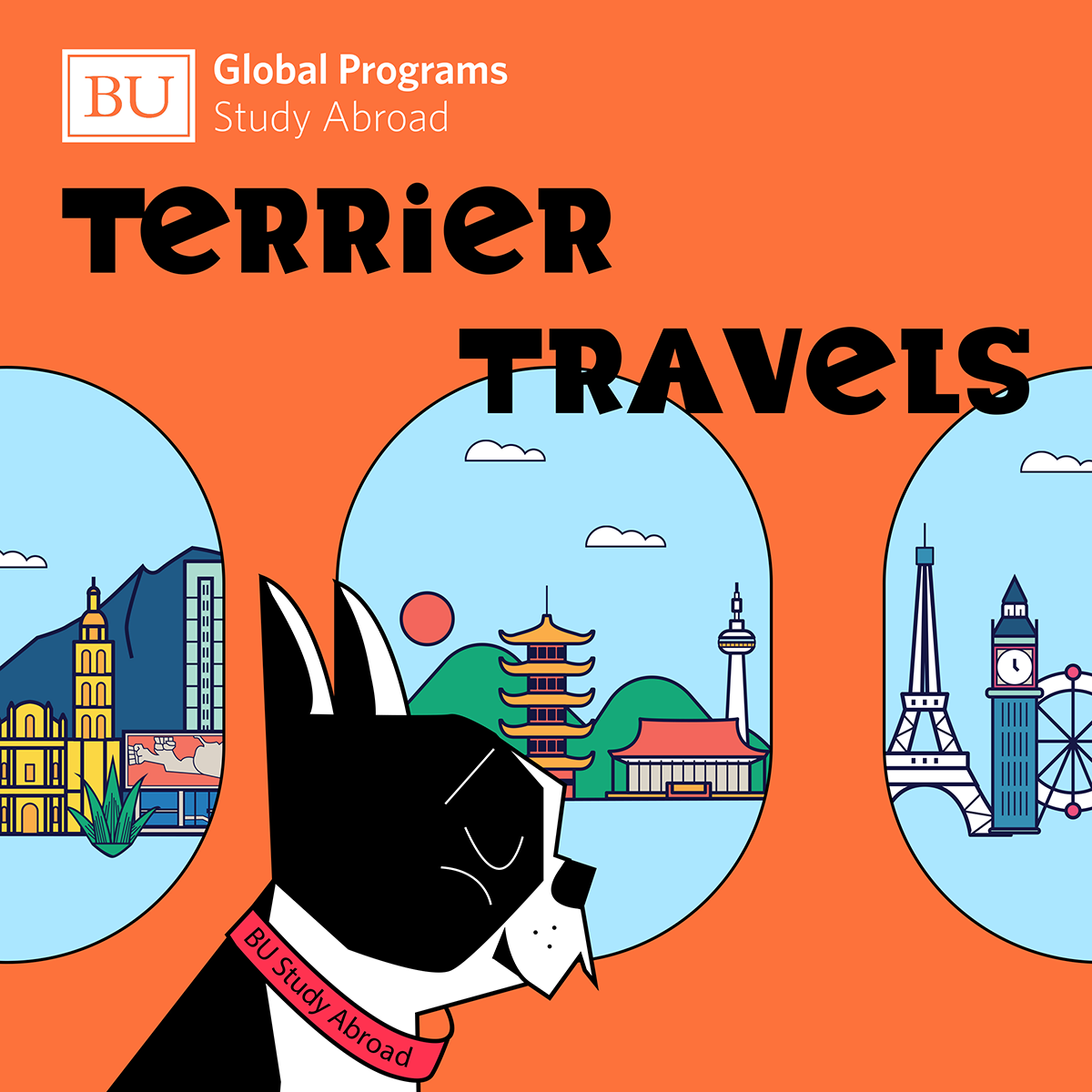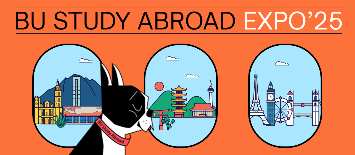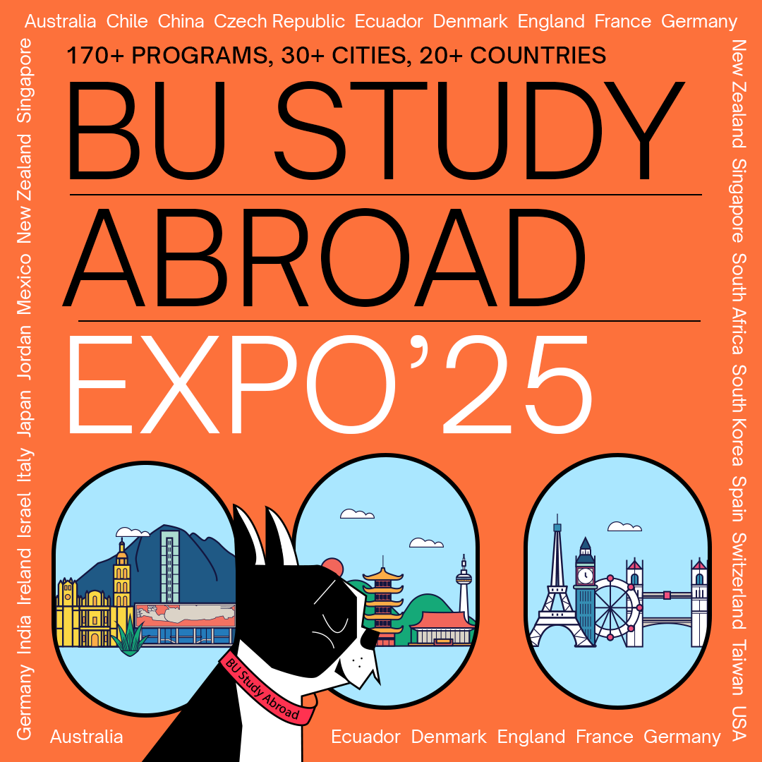 The idea behind this illustration was to bring Boston University’s mascot, Rhett, to life as a global traveler, and to make studying abroad feel exciting and approachable by showing the mascot exploring new places — just as our students do when they study abroad.